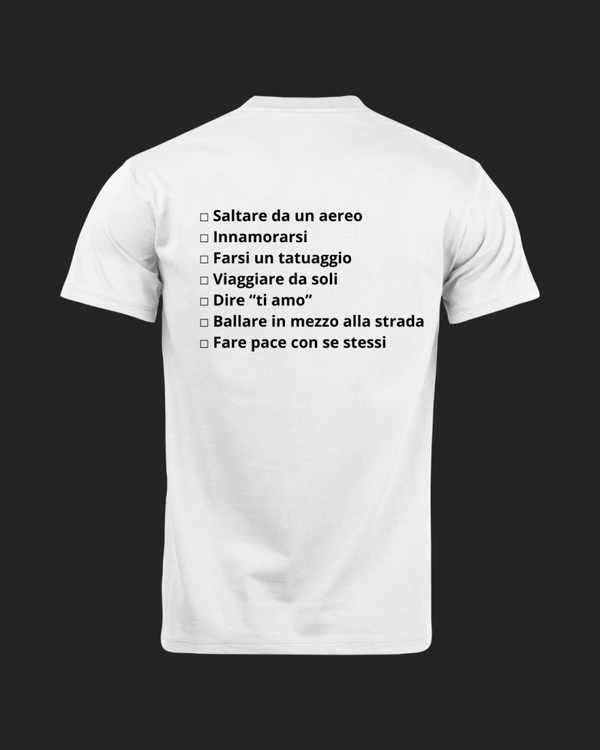 Stampata sulla schiena con una lista di 7 sfide iconiche — dal “Saltare da un aereo” al “Fare pace con se stessi” — questa maglia in 100% cotone bianco, unisex e confortevole, ti invita a scrivere la tua storia… una X alla volta.