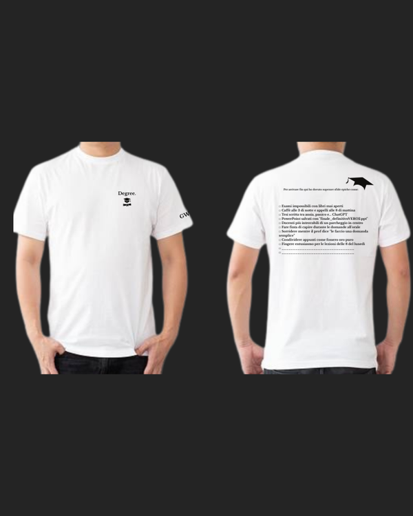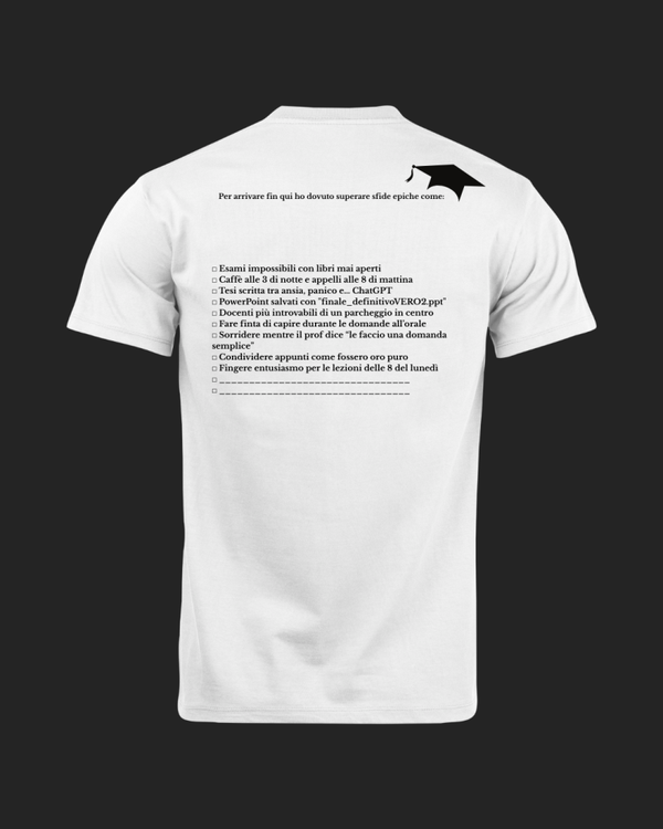 Questa t-shirt è la tua medaglia di guerra accademica: una checklist esilarante con tutte le “missioni impossibili” che solo uno studente universitario può capire.